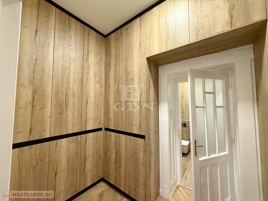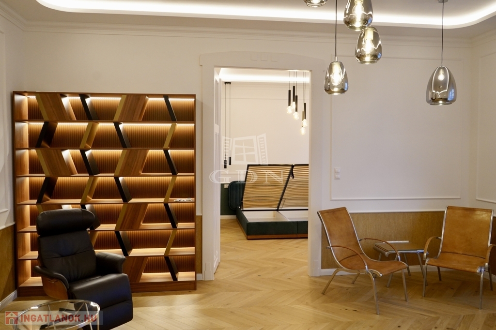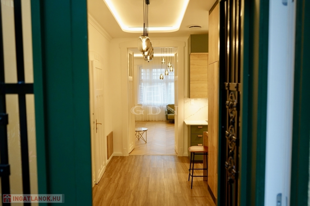 A 3,2 méteres belmagasság, a klasszikus halszálkamintás tölgyfa parketta és a felújított, patinás beltéri ajtók időtálló nagypolgári hangulatot teremtenek, amely harmonikusan kapcsolódik a modern megoldásokhoz. Az enteriőr kifinomultságát designlámpák és gondosan kiválasztott burkolatok erősítik, egységes és elegáns összképet alkotva.