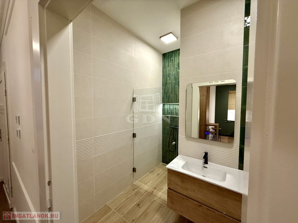Az inagtalan két fürdőszobával rendelkezik: a fő hálószobához kapcsolódó kádas fürdőben egy szauna is helyet kapott. A másik fürdőszoba zuhanyzós, mindkettő fürdőszobában WC is van. A déli tájolásnak köszönhetően a lakás rendkívül világos.
