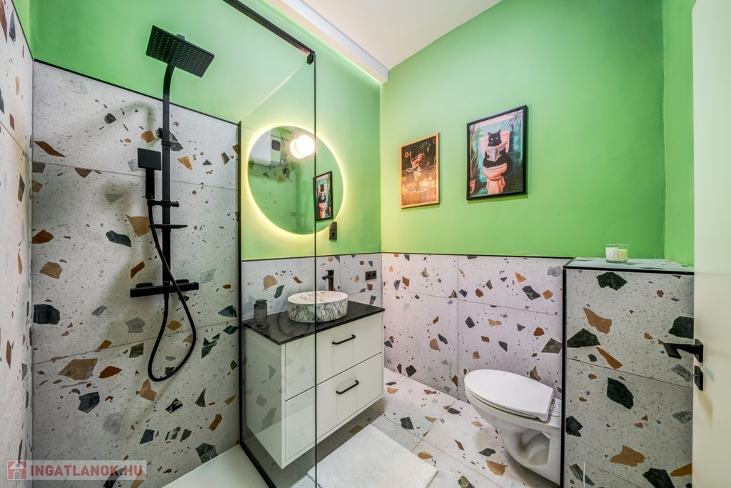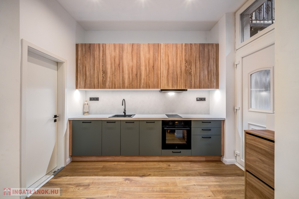 A lakás minden eleme tejleskörű felújításon esett át, így valóban 0 km-es állapotban kerül átadásra: megújult a teljes villamos- és vízhálózat, új burkolatokat, nyílászárókat és szerelvényeket kapott, valamint egyedileg gyártott, modern konyhabútorral szerelték fel. A háztartási gépek – köztük az AEG főzőlap, az Electrolux sütő és hűtő, illetve a Gorenje mosogatógép és páraelszívó – mind vadonatújak és garanciálisak, ahogyan a lakás teljes bútorzata és matraca is. A gránit mosogató tovább erősíti a minőségi kialakítást. A fűtést és hűtést inverteres klíma biztosítja, míg a melegvíz ellátásáról Ariston bojler gondoskodik.