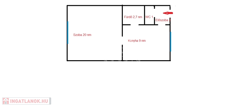 Belépve egy kisebb 2 nm-es előszobába érkezünk, az előszoba ajtóval szemben találjuk az 1 nm-es külön nyíló WC-t.