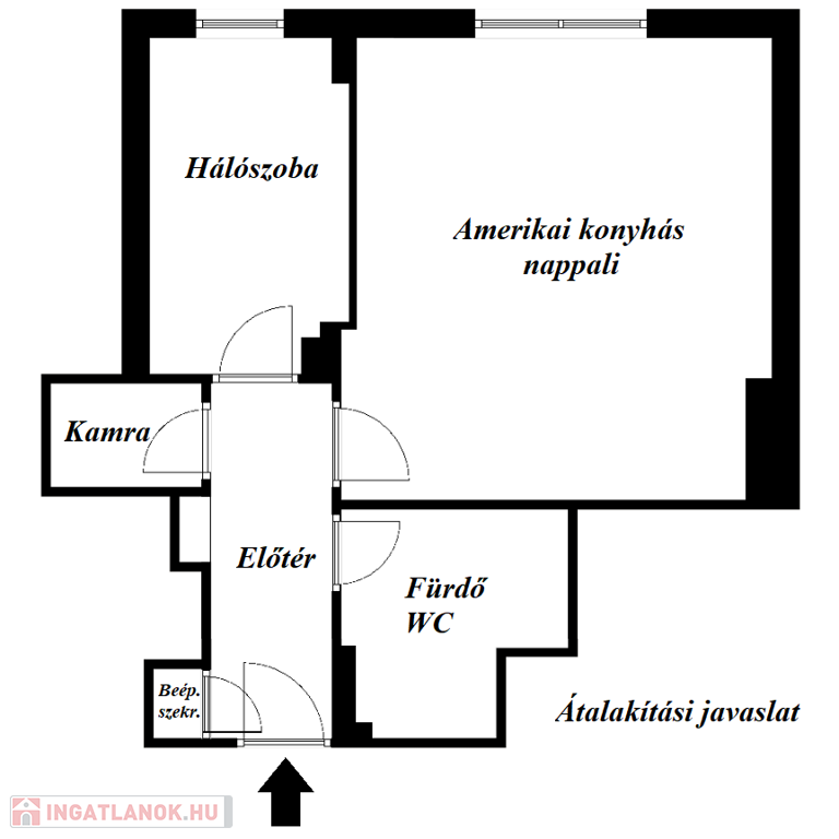 A lakás beosztás remek, de akár tovább is alakítható amerikai konyhás nappali + hálószobássá, átalakítási javaslat a képek között elérhető.