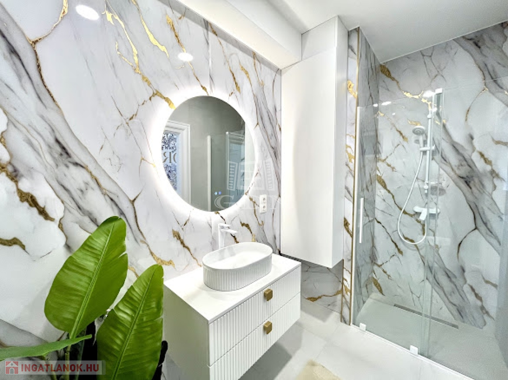 • Modern épített zuhanyzós fürdő, ízléses burkolatok