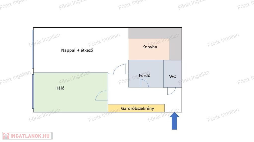 Az 54 nm-es lakás praktikus elrendezésű: amerikai konyhás nappali, külön hálószoba és fürdőszoba alkotják.