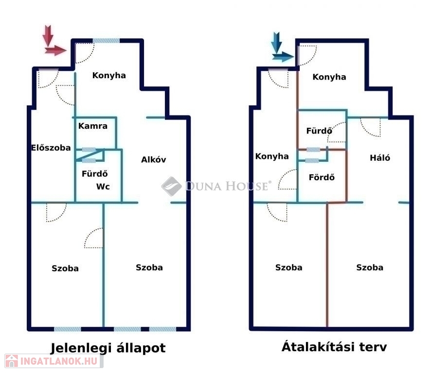 A konyha áthelyezésével akár 3 szobássá is alakítható, de mivel két bejárattal rendelkezik, akár két kis lakássá is bontható.