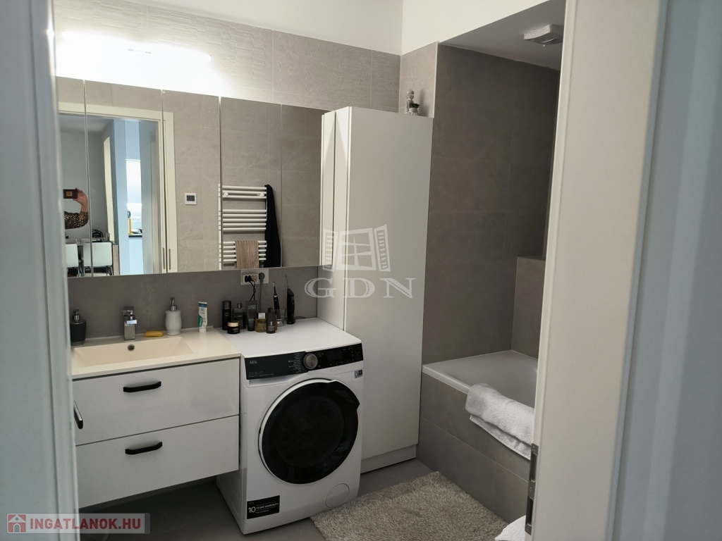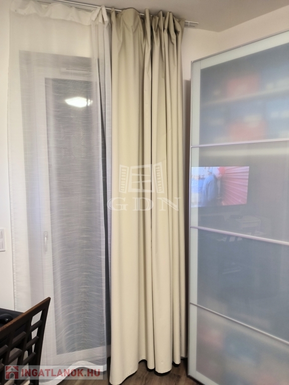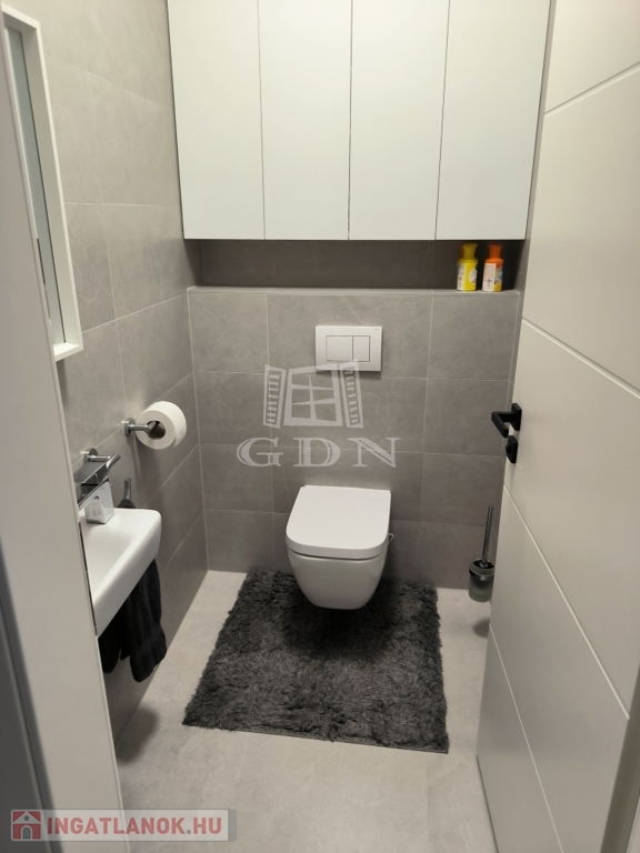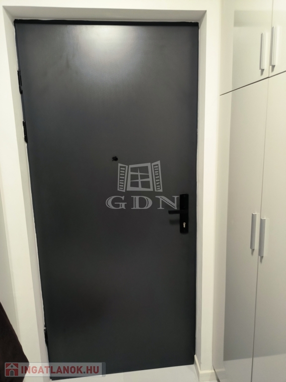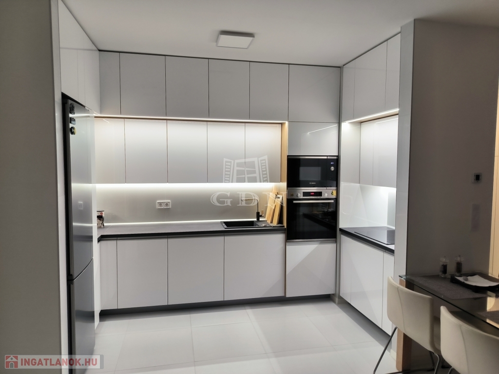 A lakásban az újszerű amerikai konyhás nappaliban beépített konyhabútor, az előszobában pedig előszobaszekrények találhatók, valamint fehér fényes, csillogó járólapok vannak ahonnét a nappaliból és a közlekedőből fürdőszoba és a WC nyílik .