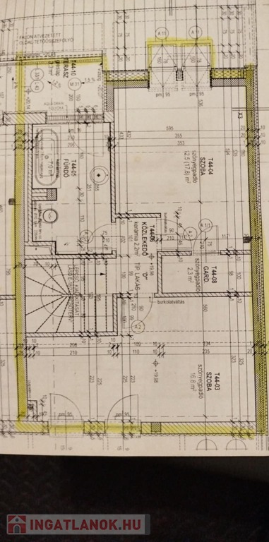 A felső szintre vezető lépcsőn a 2,2 nm-es közlekedőbe érkezünk, amiből jobbra nyílik a 16,8 nm-es laminált parkettás szoba, amit egy 2,3 nm-es jól kihasználható gardrób választ el a balra lévő 12,5 nm-es szintén laminált parkettás hálószobától.