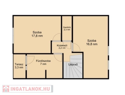 A felső szintre vezető lépcsőn a 2,2 nm-es közlekedőbe érkezünk, amiből jobbra nyílik a 16,8 nm-es laminált parkettás szoba, amit egy 2,3 nm-es jól kihasználható gardrób választ el a balra lévő 12,5 nm-es szintén laminált parkettás hálószobától.