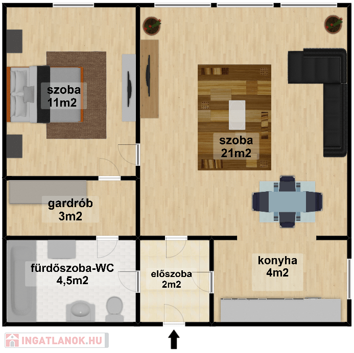 Továbbhaladva az előszoba végéből, nyílik a 22m2-es nappali, amely lehetőséget add, baráti családi összejövetelek megtartására. A hálószobából léphetünk egy praktikus gardróbba, ami a fürdőszoba és a hálószoba között kapott helyett.
