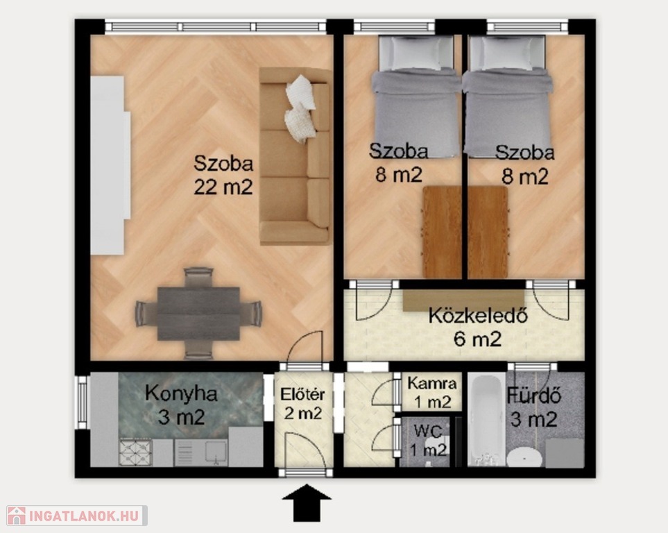 A lakásba lépve egy előtérbe érkezünk, ahonnan jobbra az ablakos, világos konyha nyílik, szemben pedig a jelenleg nappaliként használt, tágas egész szoba található. Balra egy közlekedő folyosóról érhető el a külön WC, a kamra, a két félszoba, valamint a kádas fürdőszoba, ahol a mosógép kiállása is kialakításra került.