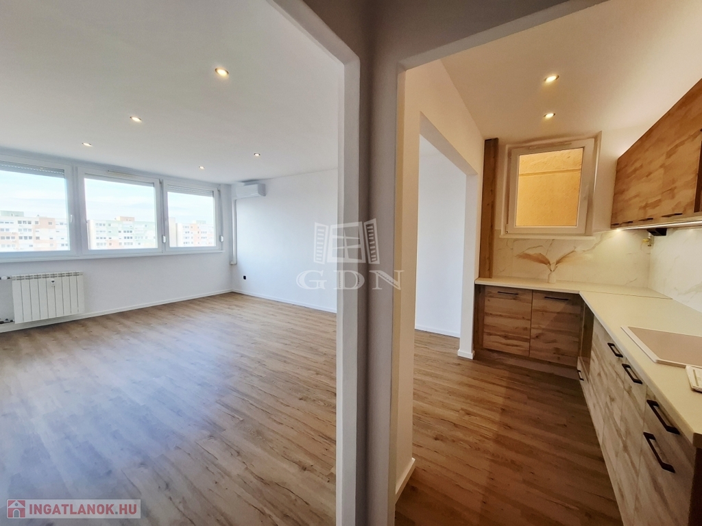 Az Újváros parkban, egy 10 emeletes, rendezett és szigetelt panelház 9. emeletén található ez a 46 m²-es, napfényes kétszobás lakás, amely teljes generál felújításon esett át.