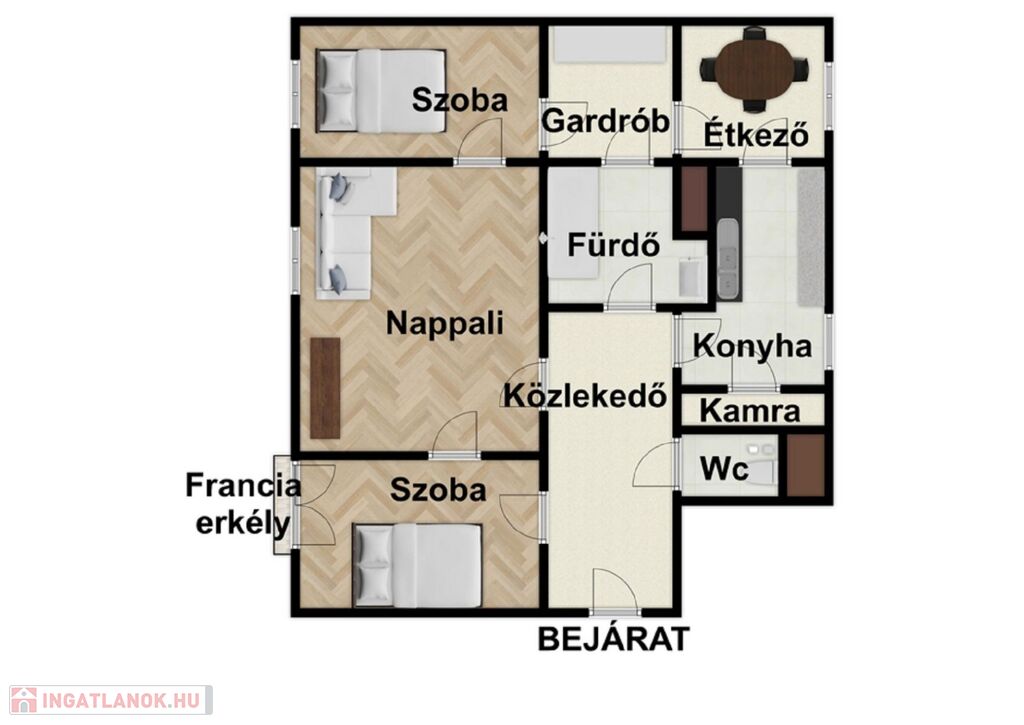 -75m2-es lakás(2 szoba, fürdőszoba, wc, nappali, konyha, kamra, közlekedő és egy gardrób)