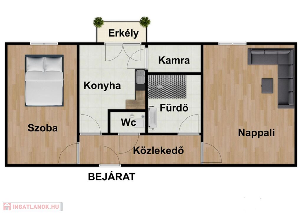 -48nm-es lakás(konyha, nappali, 1 lakószoba, fürdőszoba, kamra és egy különálló wc)