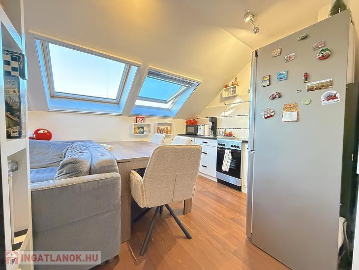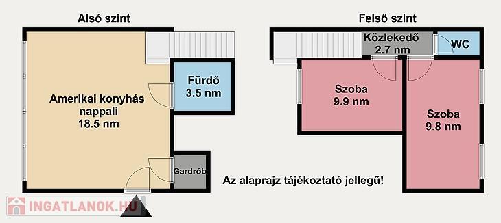 Az ingatlan nettó 47 nm, bruttó 58 nm alapterületű, praktikus elosztású: az alsó szinten amerikai konyhás nappali, a felső szinten pedig két külön nyíló hálószoba található. A házközponti fűtés egyedi méréssel működik, a klíma pedig a nyári hónapokban biztosítja a kellemes hőmérsékletet.