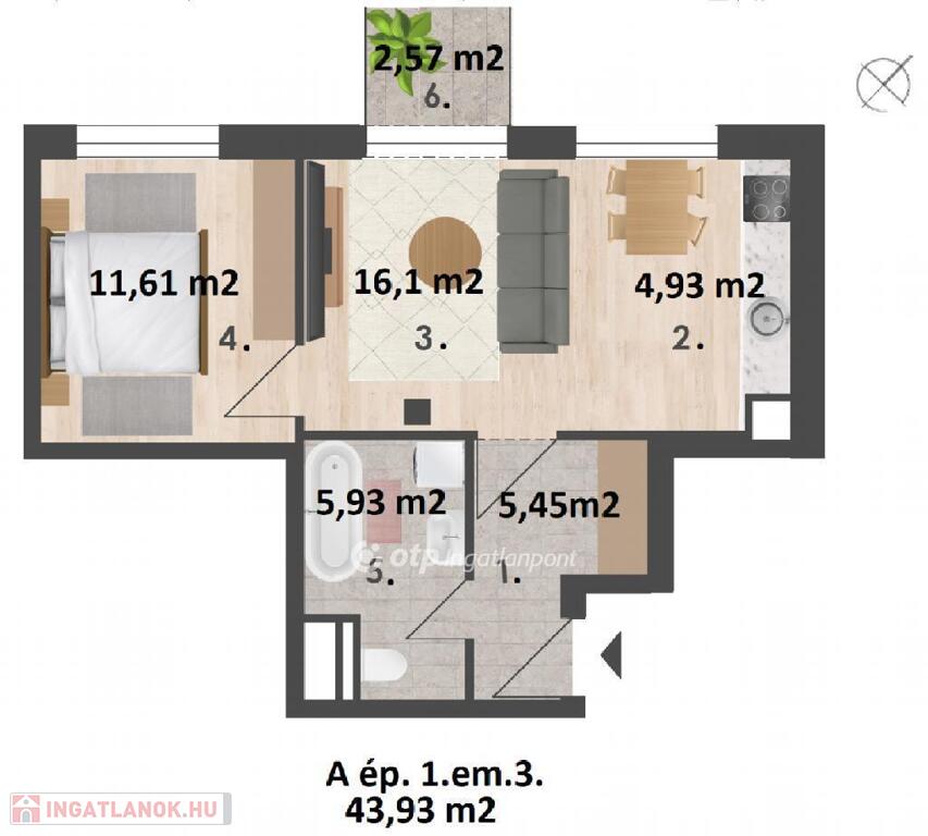 Eladó 2 szobás: nappali plussz 1 hálószobás, első emeleti, 43,93 nm-es, lakás. Az otthon kényelméhez hozzájárul továbbá egy kis erkély.