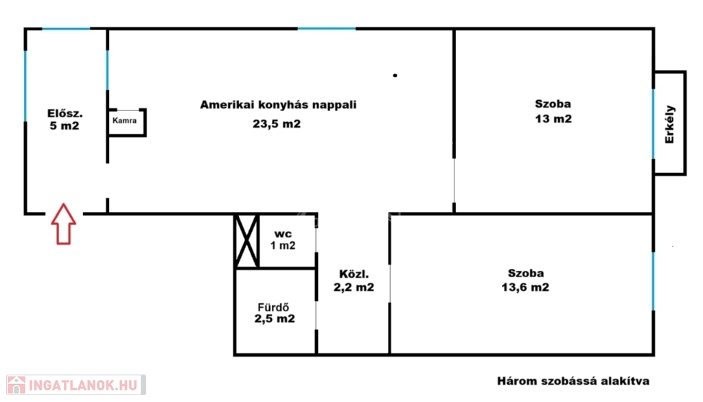 A lakás tulajdoni lap szerint 55 nm-es, 2 szobás. A tulajdonosok a társasháztól megvásároltak további 5 nm-t, mely előszobaként funkcionál.