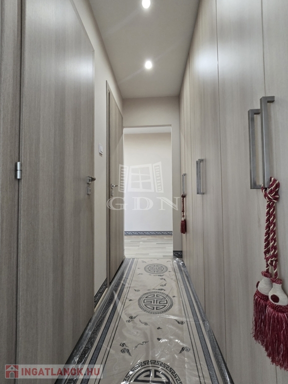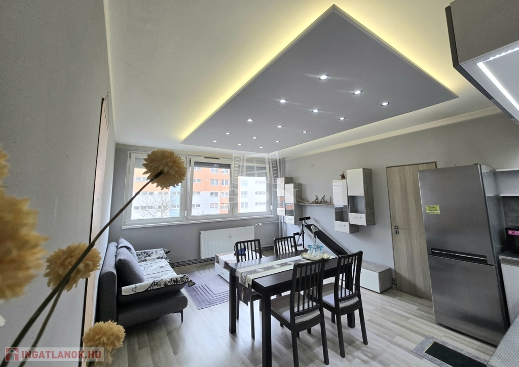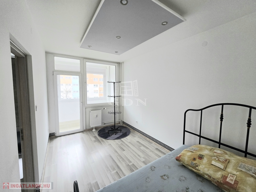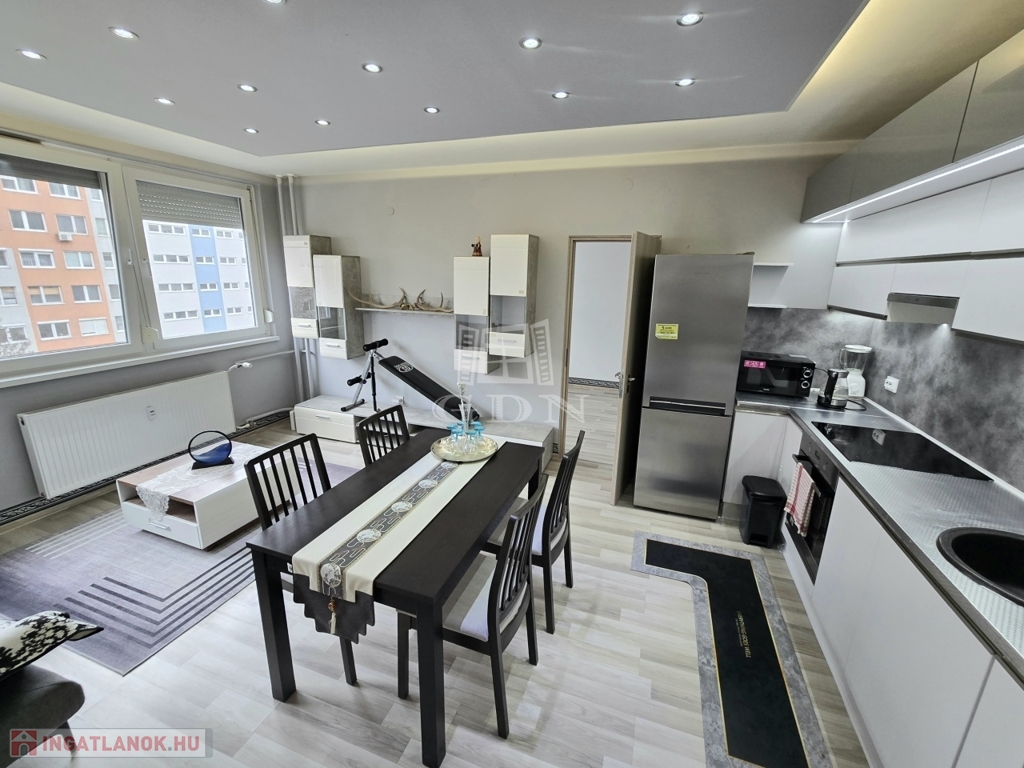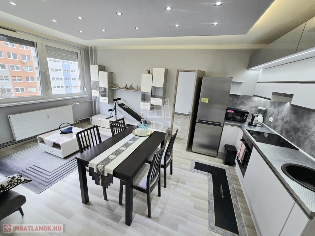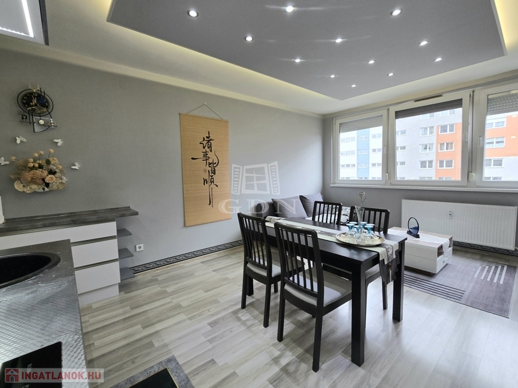 XIV. kerületben, a Füredi lakótelepen eladó egy 70 m2-es, beépített LOGGIÁS (2 m2), 3 szobás+…1 félszobás, CSENDES, VILÁGOS, FELÚJÍTOTT, panorámás lakás. Tulajdoni lapon 3 szobás, de a konyha bekerült a nappaliba és így egy fél szobával bővült a lakás.