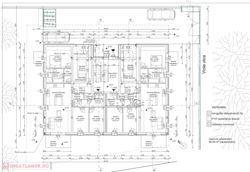 -Lakás alapterület:88,6 m² + garázs 16 m² + teraszok 8 m² és 2,85 m²