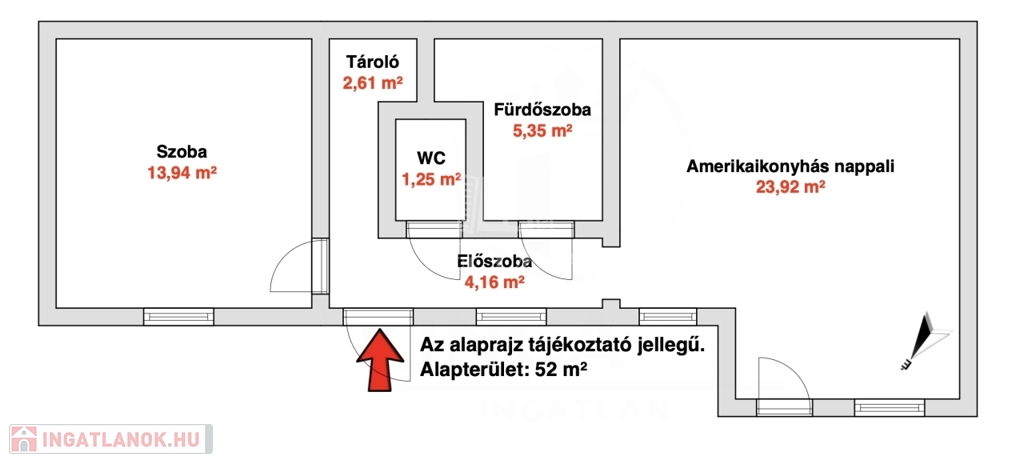 A lakás praktikus elrendezésű: amerikai konyhás nappali + hálószoba, továbbá külön fürdőszoba és WC szolgálja a kényelmet. A lakáson belül egy külön tárolóhelyiség is rendelkezésre áll.