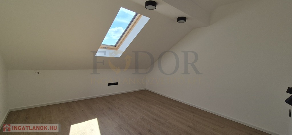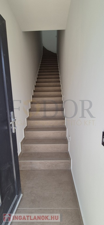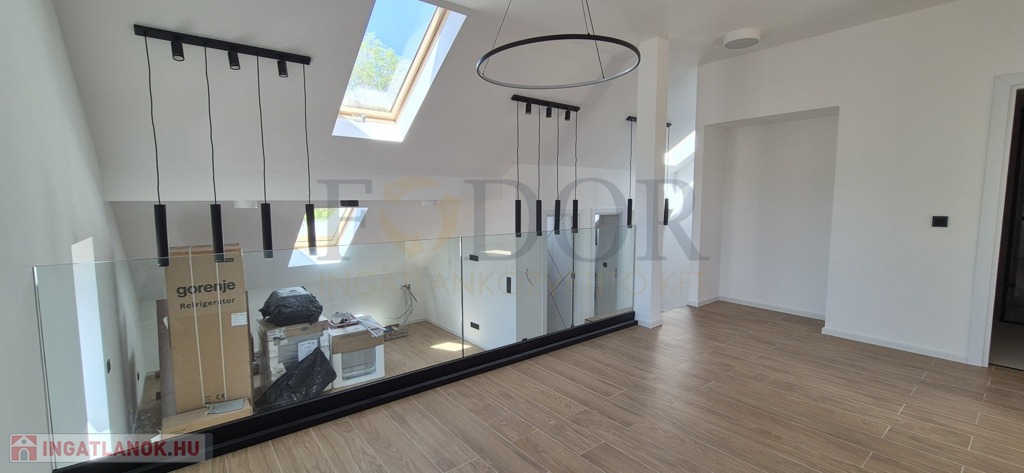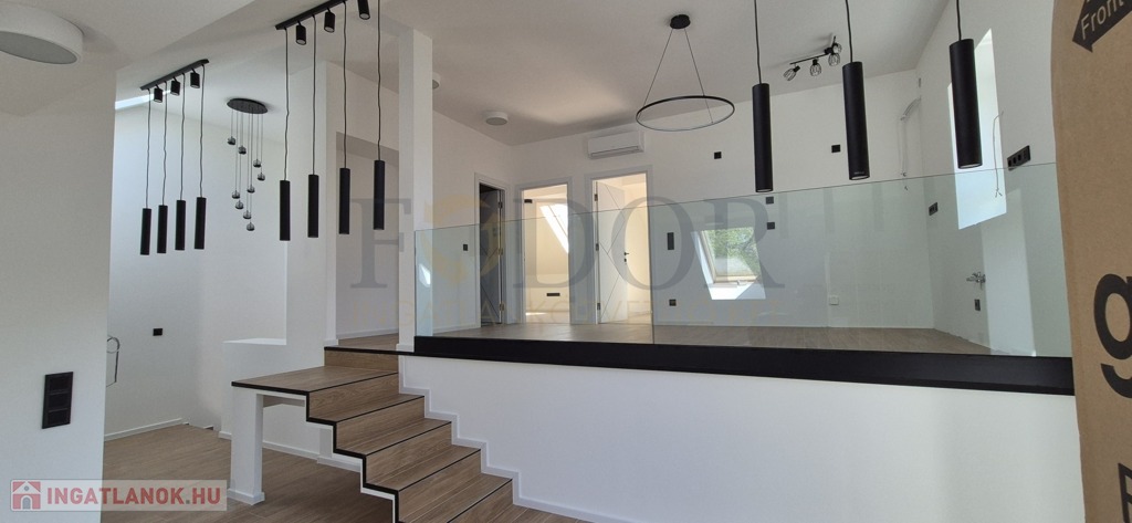 • valamint egy nagyobb alapterületű,112 m²-es nettó alapterülettel rendelkező, belső kétszintes, nappali + 2 hálószobás, közel 200 m²-es privát kerttel rendelkező otthon. Ára: 133 Millió Ft.