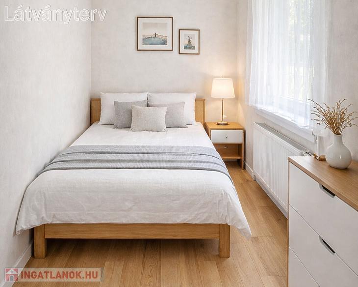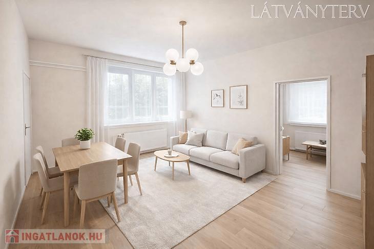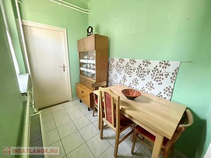 Előszoba, L alakú étkezős konyha, nappali, hálószoba, kádas fürdőszoba, kamra áll rendelkezésre. A nyílászárók 5 éve műanyag, hőszigetelt ablakokra és biztonsági ajtóra lettek cserélve. Az ablakok redőnnyel és ráccsal ellátva, egy része szúnyoghálós is. A villanyvezetékeket rézre váltották. A fűtés gázcirkóval biztosított lapradiátorokon keresztül. Tartozik a lakáshoz egy 4 nm-es zárható tároló. A szobák ablakai a parkosított udvarra nyílnak.