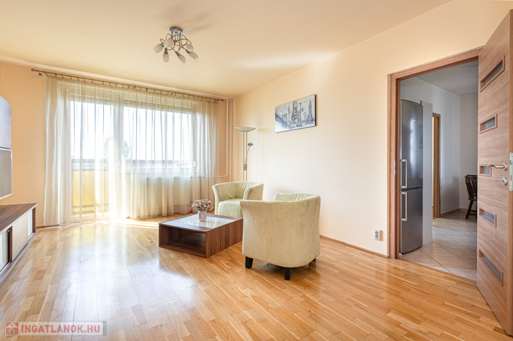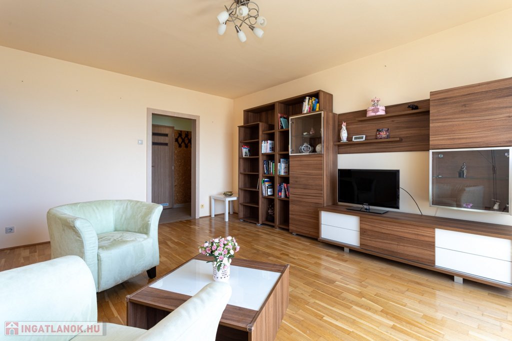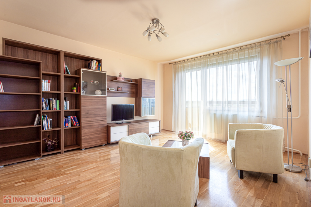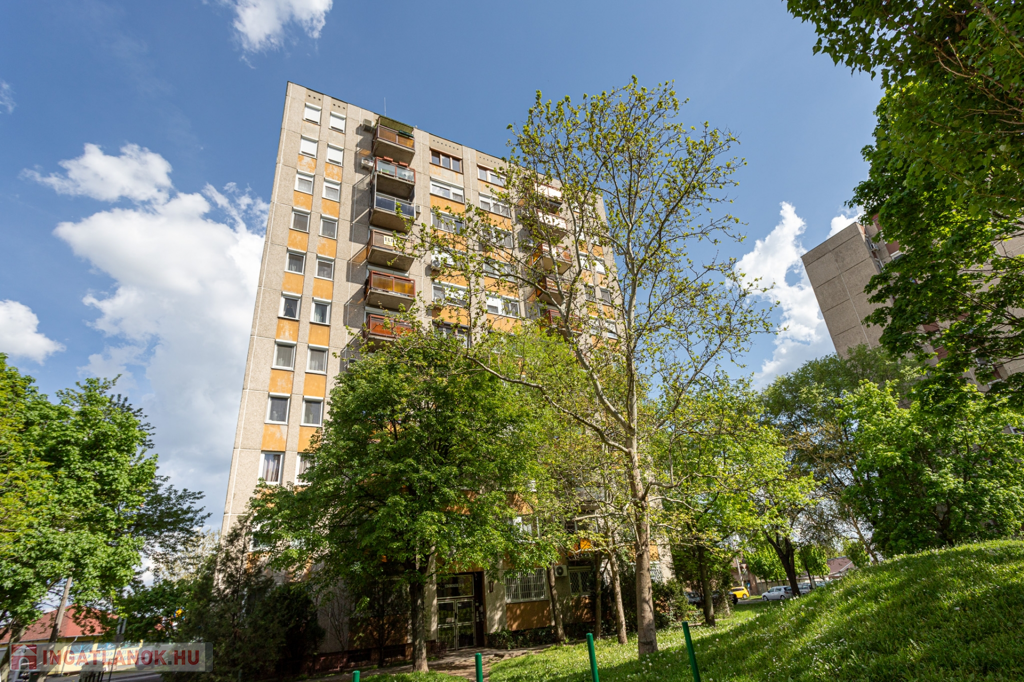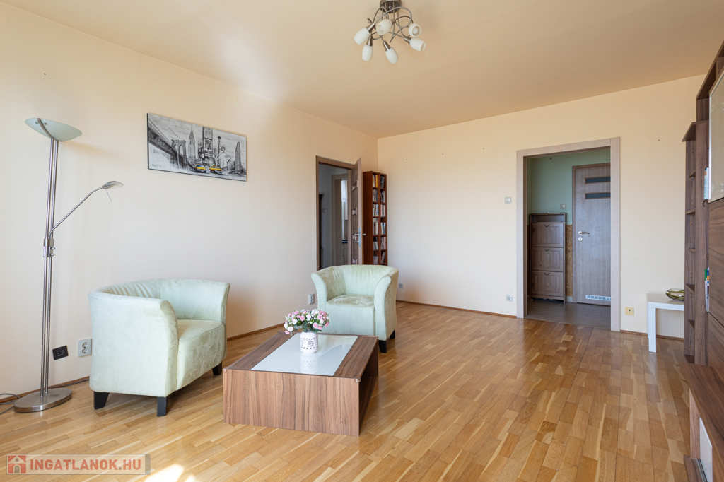Budai hegyekre örök panorámás, 7. emeleti, nappali + 2 szobás, erkélyes, nyugati fekvésű, kifejezetten világos, felújított lakás eladó, egy szépen karbantartott 10 emeletes (liftes) panelházban.