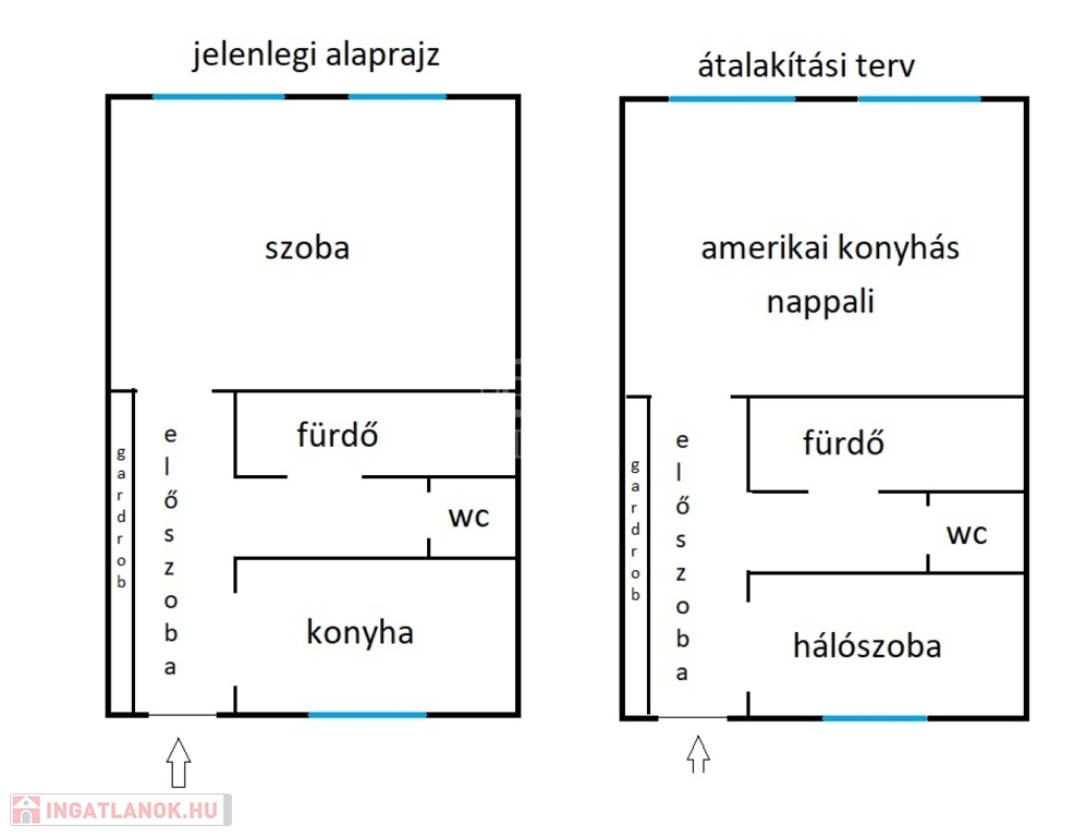A konyha áthelyezésével egy amerikai konyhás nappali és egy hálószoba könnyedén kialakítható!