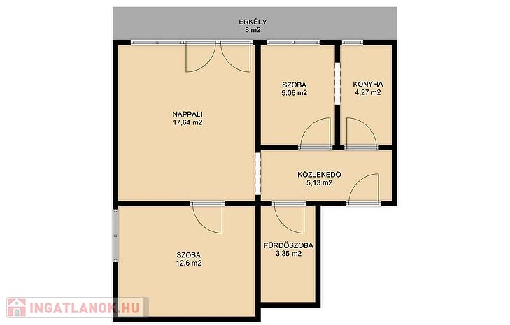 A közlekedőből nyílik a konyha és az étkező, melyeket egy széles boltív választ el egymástól, továbbá innen érhető el a fürdőszoba és a nappali is. A nappaliból kijárat nyílik a tágas loggiára, valamint innen közelíthető meg a külön nyíló hálószoba.
