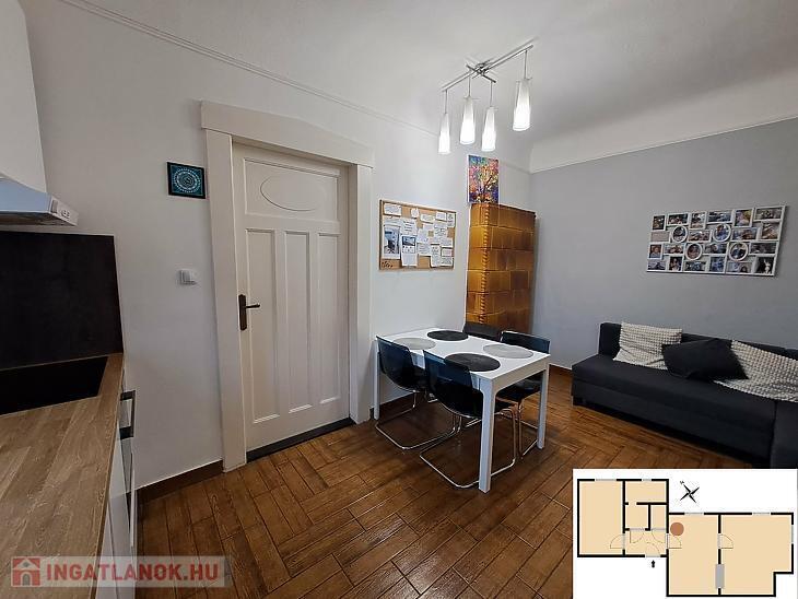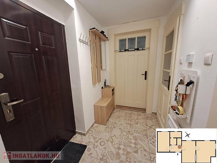 A lakásba belépve elsőként az előszobába térünk, ahonnan nyílik egy hálószoba, a kádas fürdő, külön nyíló wc és az étkezős konyha, ahonnan tovább juthatunk a nagyobb hálószobába. A lakás néhány éve részleges felújításon esett át. Új burkolat a szobákban és az előszobában, többségében ki lettek cserélve a szaniterek, új IKEA konyhabútor, konyhai gépesítés és egy konyhai víztisztító lett beépítve, ami a csapvíznél és az ásványvíznél tisztább, egészségesebb ivóvízről gondoskodik. Az elektromos hálózat felújítása már korábban megtörtént, a teljesítmény 3X16 amperre lett bővítve, amely lehetővé teszi a nagy háztartási gépek egyidejű használatát. Az ablakok modern, 3 rétegű üvegezéssel ellátott faablakok, melyeket fém redőnnyel és szúnyoghálóval szereltek fel. 2022-ben kívülről lett szigetelve a lakás. A gázkazánok javítása folyamatban van. A lakásban megőrzésre került egy cserépkályha, mely télen nem csak hangulatos, de jó meleget is képes biztosítani. A nagyobb szoba nyáron légkondicionálóval hűthető. A konyha gépesítése (mosogatógép, hűtő), a mosógép és a szárító a vételár részét képzi.