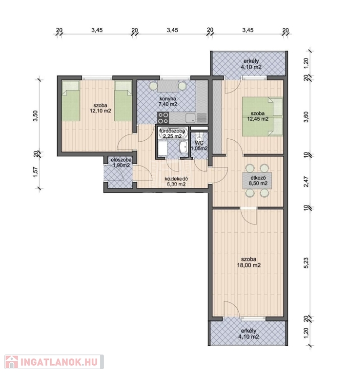 Az ingatlan praktikus elrendezésű: tágas, klimatizált nappali, két külön nyíló hálószoba, konyha, hall, fürdőszoba, valamint külön WC található benne.