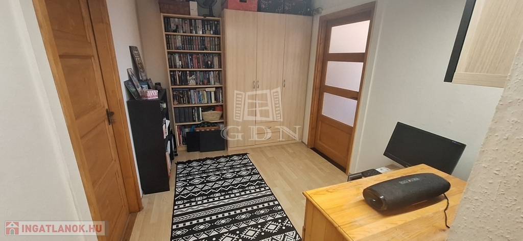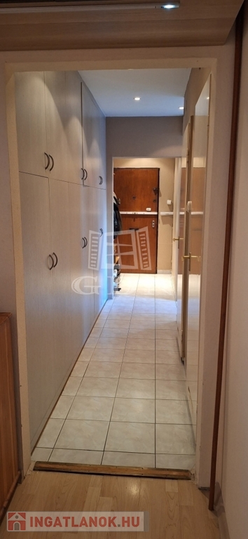A szobák és a hall laminált parkettával, a többi helyiség járólappal burkolt. A közlekedőben végig beépített gardróbszekrény biztosít elegendő tárolóhelyet.
