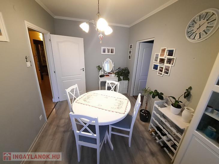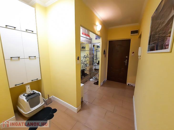 A lakás praktikus elosztású: 2+1 szoba, ablakos konyha, külön fürdő és WC, valamint két tárolóhelyiség a lakáson belül, egy gardrób és egy nyitott spejz . A burkolatok jó állapotúak, a szobákban laminált parketta, a közlekedő és a konyhában pedig járólap található. A lakásban teljes körű villamossági vezeték csere történt. A konyhabútor gépesítve a vételár részét képezi. Egyéb bútorok megbeszélés tárgyai. A bejárati és a belső ajtók cseréje megtörtént. Hűtő-fütő klíma került beszerelésre. Az ablakok régebbiek de lelettek festve.
