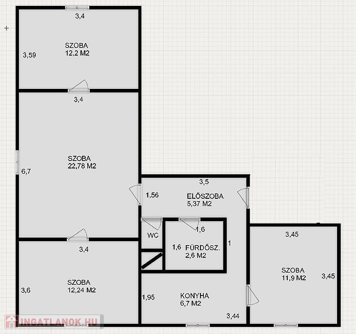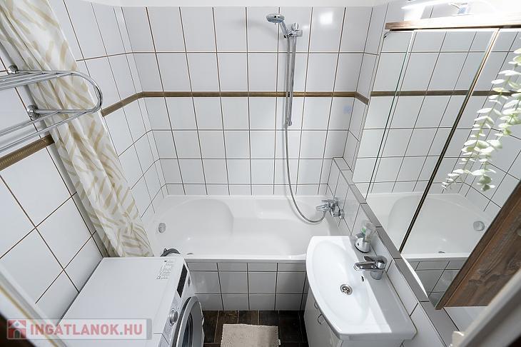 A közlekedő és a konyha járólappal burkolt, a szobák laminált parkettásak.A fürdőszoba szép állapotú, kádas kialakítású, a WC külön helyiségben található a két vízórával együtt.