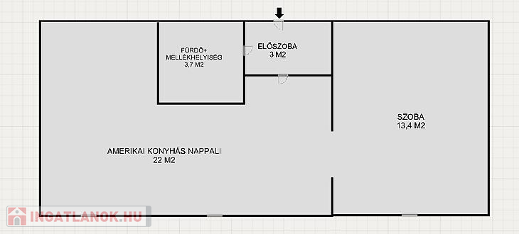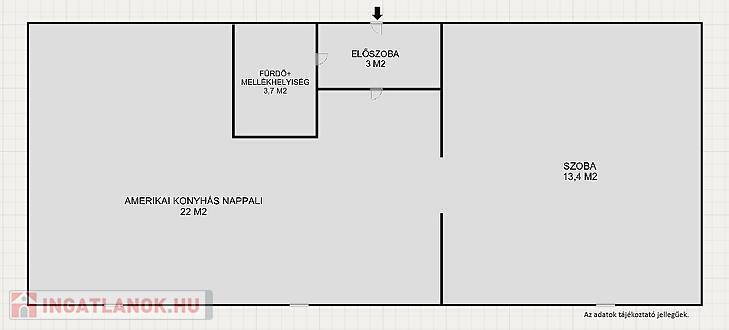 Tágas amerikai konyhás nappali, szoba, konyha, fürdőszoba- mellékhelyiség egyben és előszoba áll rendelkezésre.