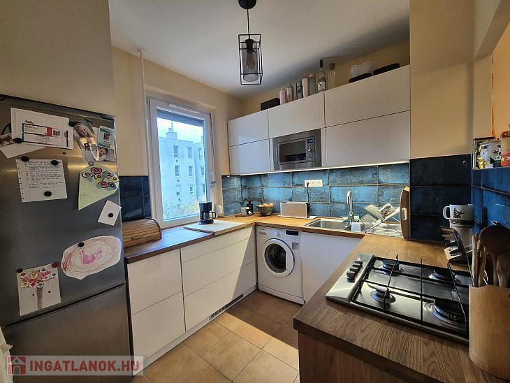 A lakás jó elosztású, világos, a szobákban jó minőségű laminált parketta található a többi helyiség járólappal burkolt. Az otthon melegéről házközponti kazán gondoskodik. A nyílászárók műanyag thermo üvegesek, redőnnyel ellátottak. A beépített bútorok a vételár részét képezik (konyhabútor gépesítve és előszobabútor). A nappaliból csatlakozik az erkély, amely szép kilátást biztosít a Budai hegyekre.