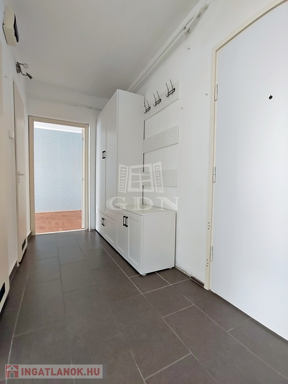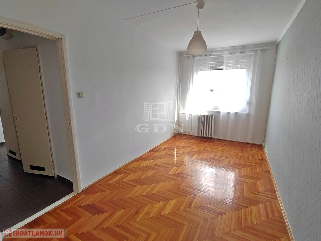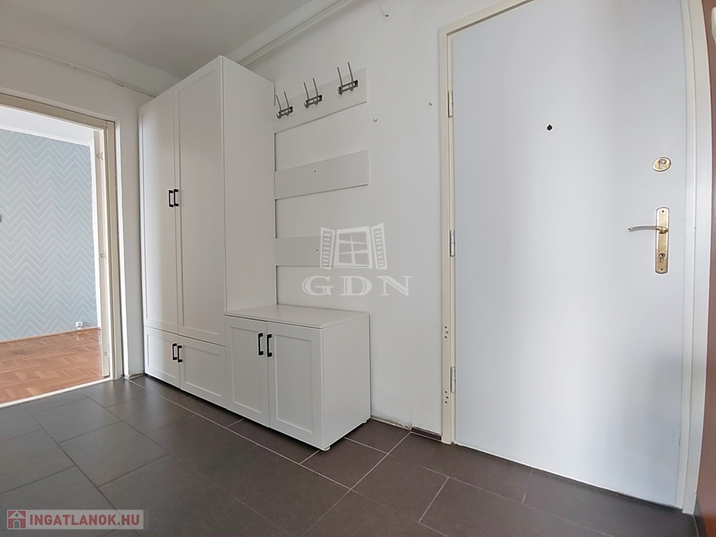 A lakás praktikus elrendezésű: minden helyiség külön nyílik az előszobából – nappali, hálószoba, konyha, fürdőszoba és külön WC.
