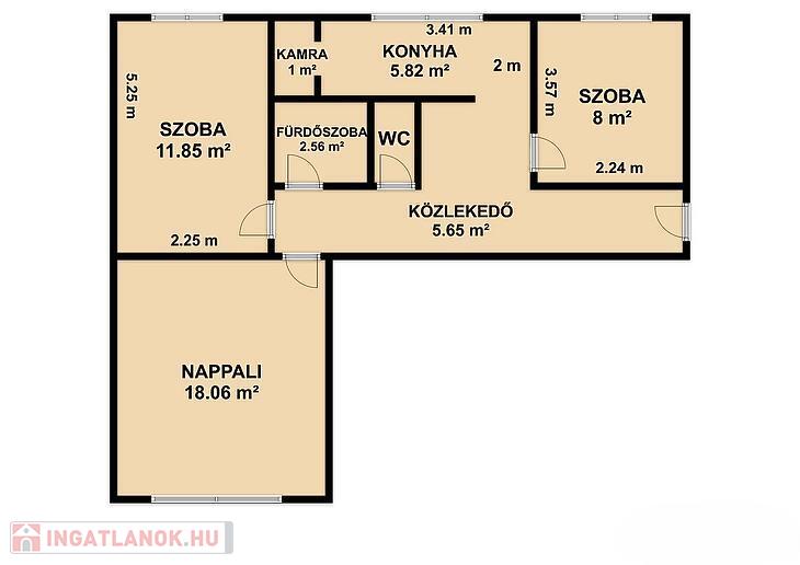 Nappali +2 félszoba, étkezős konyha + kamra, kádas fürdőszoba, wc, közlekedő, előszoba.
