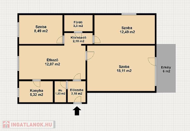 3 szoba, konyha, étkező, kádas fürdőszoba, külön wc, közlekedő, előszoba, erkély
