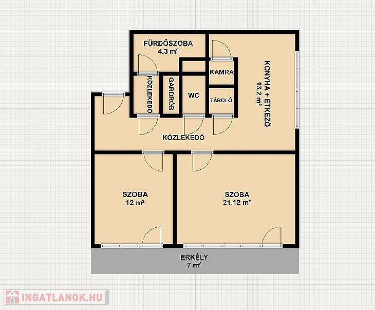 2 szoba, étkezős konyha, kamra, gardrób, zuhanyzós fürdőszoba, külön mellékhelyiség, közlekedő, előszoba, erkély.