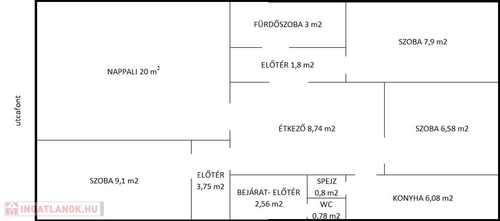 • a konyha, étkező és az egyik szoba összenyitható, így akár egy modern amerikai konyhás nappali–étkező is kialakítható