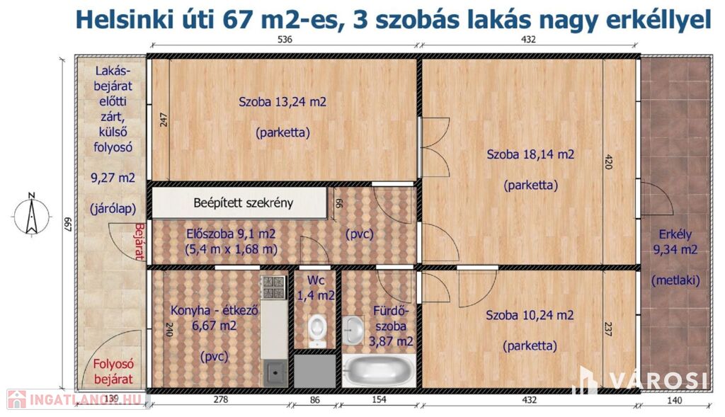 Ez a 67 m2-es, 3 szobás lakás a Helsinki út egyik 4 emeletes épületének magasföldszintjén helyezkedik el.
