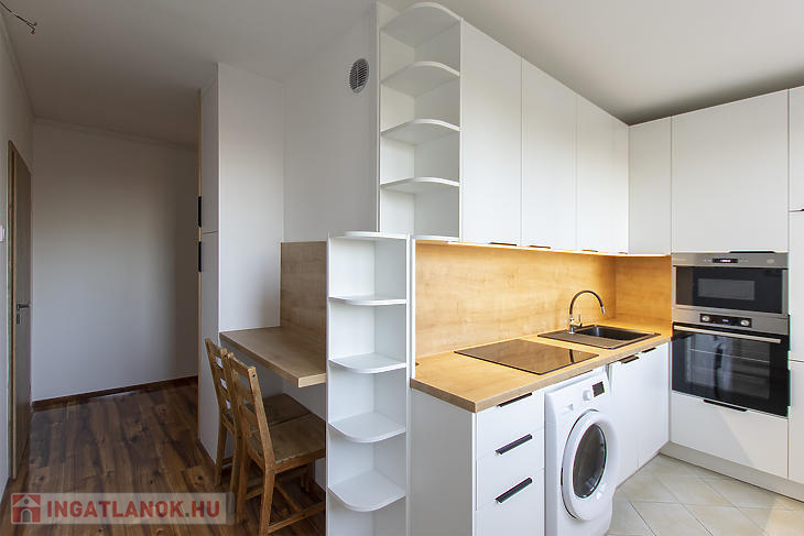 A konyha praktikus kialakítású, beépített sütővel, főzőlappal és mosogatógéppel felszerelt, így minden adott a kényelmes főzéshez. A fehér szekrények és a fa hatású munkalapok harmonikus, letisztult hangulatot teremtenek. A konyha mellett egy kis étkezőrész is kialakításra került, amely ideális egy gyors reggelihez vagy egy kellemes vacsorához.