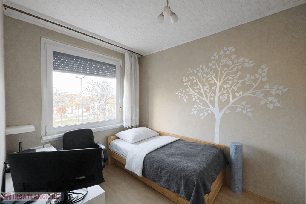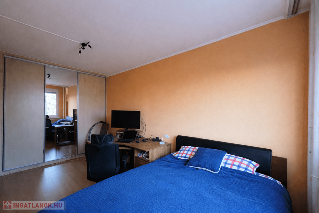 A 3 szoba külön nyílik, a nappali kellemesen világos, a reggeli-keleti napfény szépen bevilágítja a teret. A 2 hálószobában pedig beépített szekrények találhatók. Az nappali mellett található szoba helytakarékosság szempontjából tolóajtóval rendelkezik.