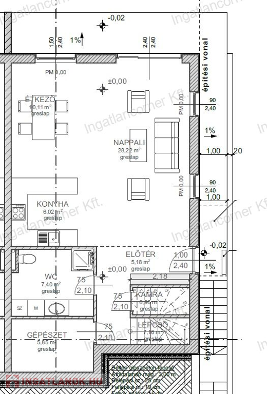 •Földszint: amerikai konyhás nappali, fürdő, dupla tároló, 10 m²-es terasz, 161,5 m² saját kert