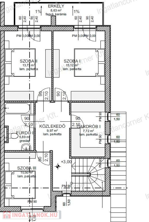 •Emelet: 3 szoba, gardrób, fürdő, 9,77 m² erkély