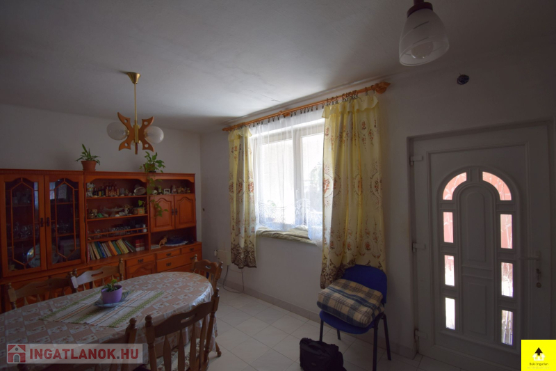 •A földszinti részén (ami inkább magasföldszint) található egy tágas konyha étkezővel, 3 szoba, egy közlekedő, egy kamra egy fürdőszoba és egy wc, valamint a bejáratnál egy félig fedett terasz.