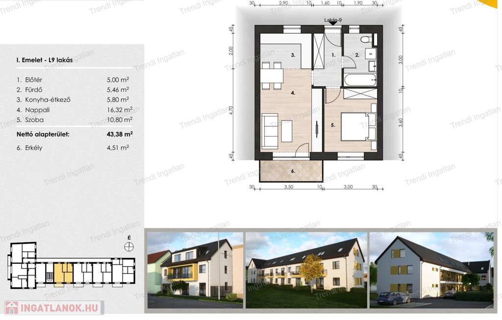 A meghirdetett 1. emeleten található 43,38 nm-es ingatlanban amerikai konyhás nappali, szoba, fürdőszoba, előtér kerül kialakításra. A nappaliból 4,51 nm-es erkély nyílik.
