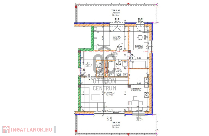 --két 20 nm-es terasz, a K-i fekvésű a nappaliból, a Ny-i a két hálószobából nyílik