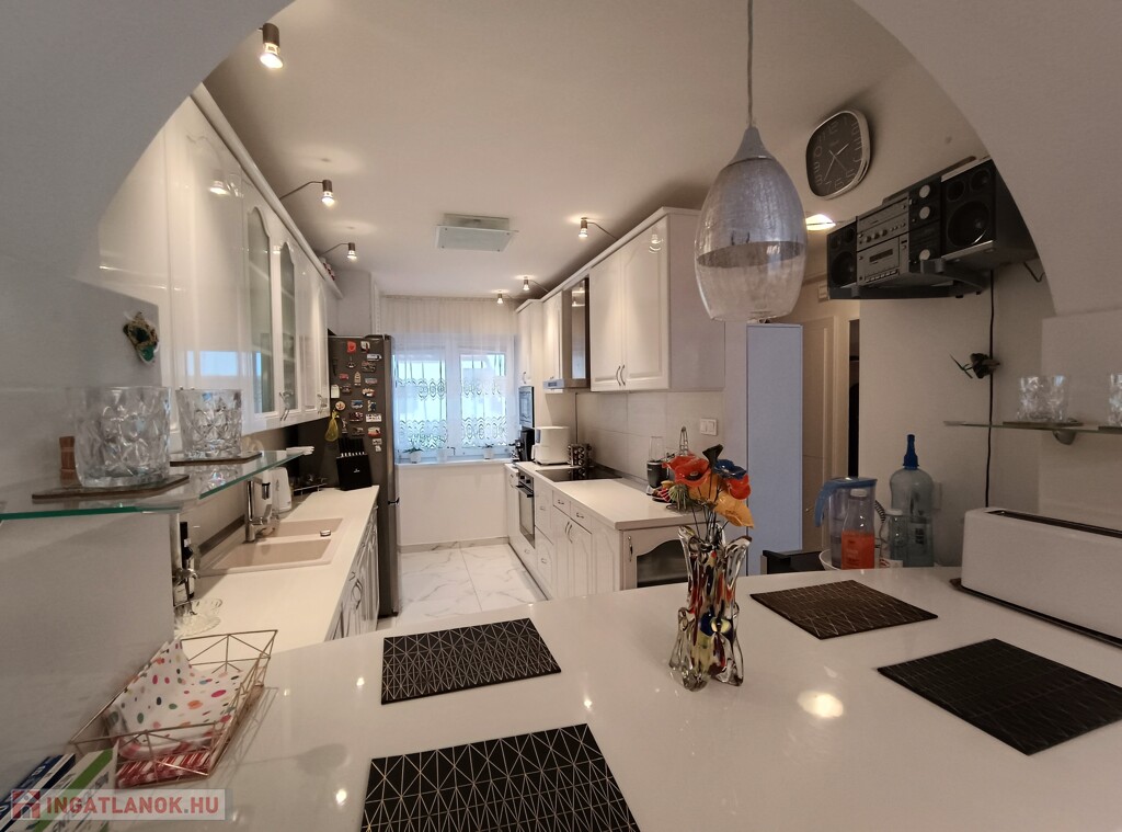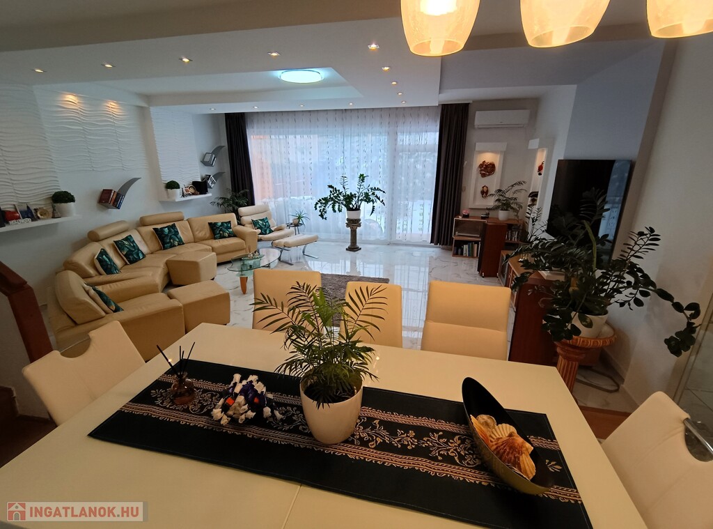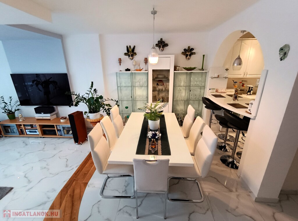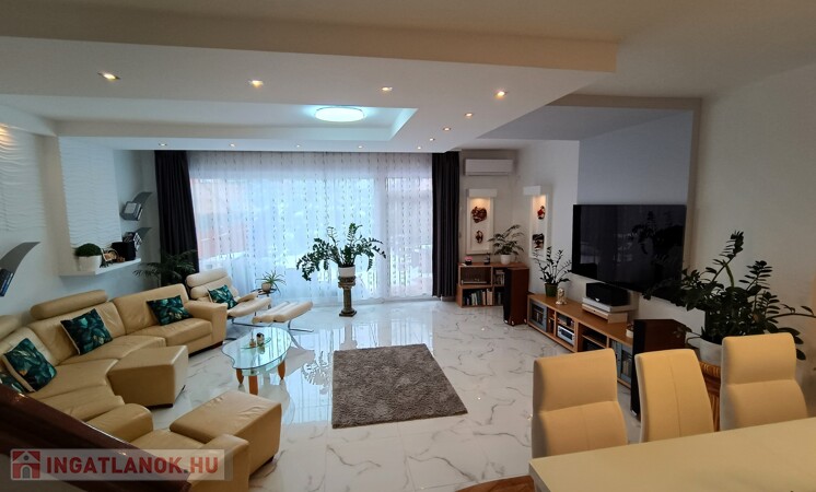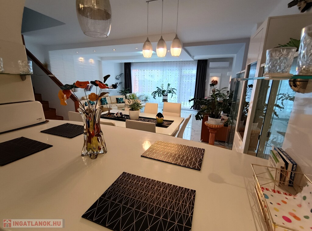 Csendes utcában található világos, kelet – nyugati fekvésű kertkapcsolatos ingatlan. Téglaépítésű, nettó 130m²-es, (hasznos alapterület 102m²) háromszintes, szigetelt sorházi lakás, garázzsal, előkerttel, kamrával. Öt éve teljeskörűen felújított, modern, igényes megjelenésű lakás, napfényes, tágas terekkel.