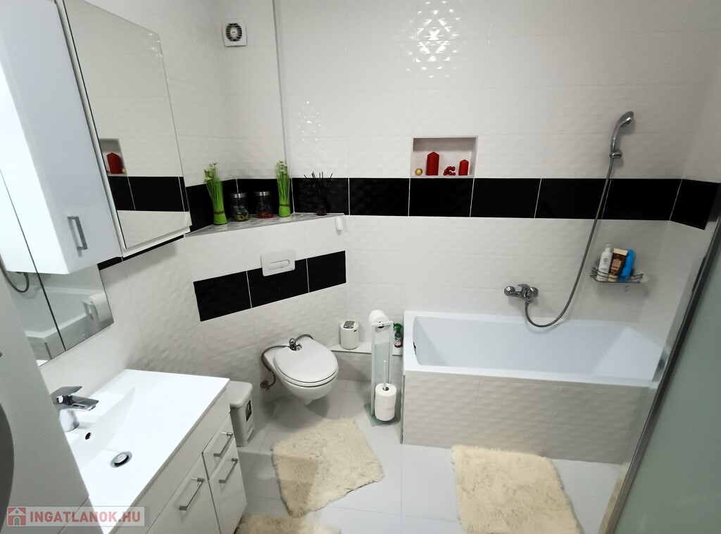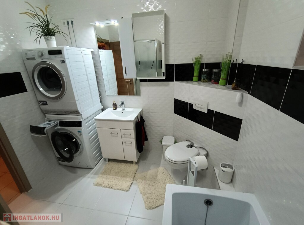 - Alsó szint helyiségei: előszoba, konyha, étkező és nappali egyben, zuhanykabinos fürdőszoba + WC. Az előszobában igényes beépített szekrények találhatók.