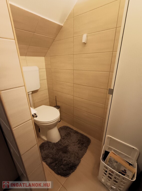 - Burkolatok: Az emeleten két hálószoba burkolata laminált parketta, a többi helyiség magas kopásállóságú járólappal burkolt.